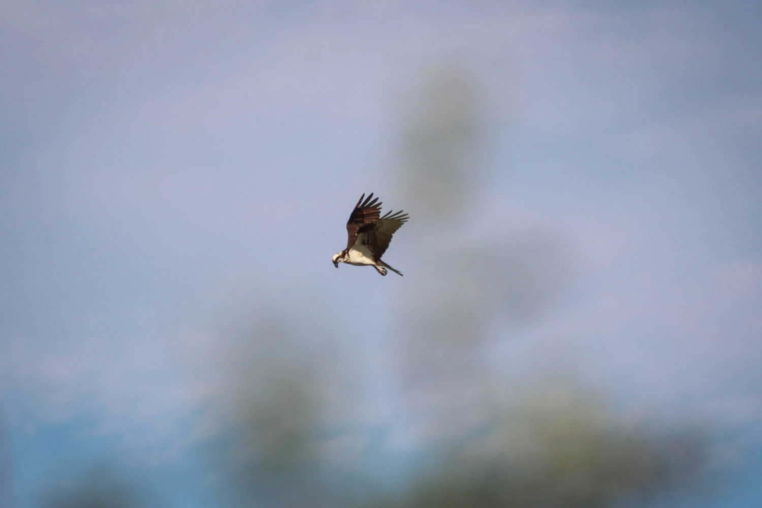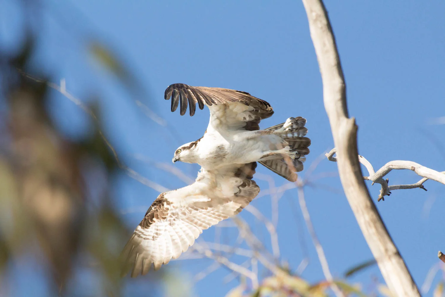 Ospreys are fish-eating birds of prey with a cosmopolitan range. They are large raptors, reaching more than 24 in in length and 71 in across the wings. It possesses specialized physical characteristics and exhibits unique behavior to assist in hunting and catching prey. The osprey and owls are the only raptors whose outer toe is reversible, allowing them to grasp their prey with two toes in front and two behind. This is particularly helpful when they grab slippery fish.